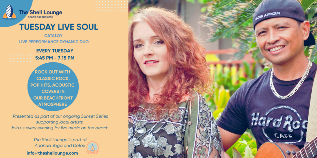 Spend your Saturday night with fun live jams by Rico and Riri at The Shell Lounge, from 6:00 PM – 7:30 PM. Enjoy lively performances, beachside vibes, refreshing cocktails, and the perfect setting to unwind with friends.